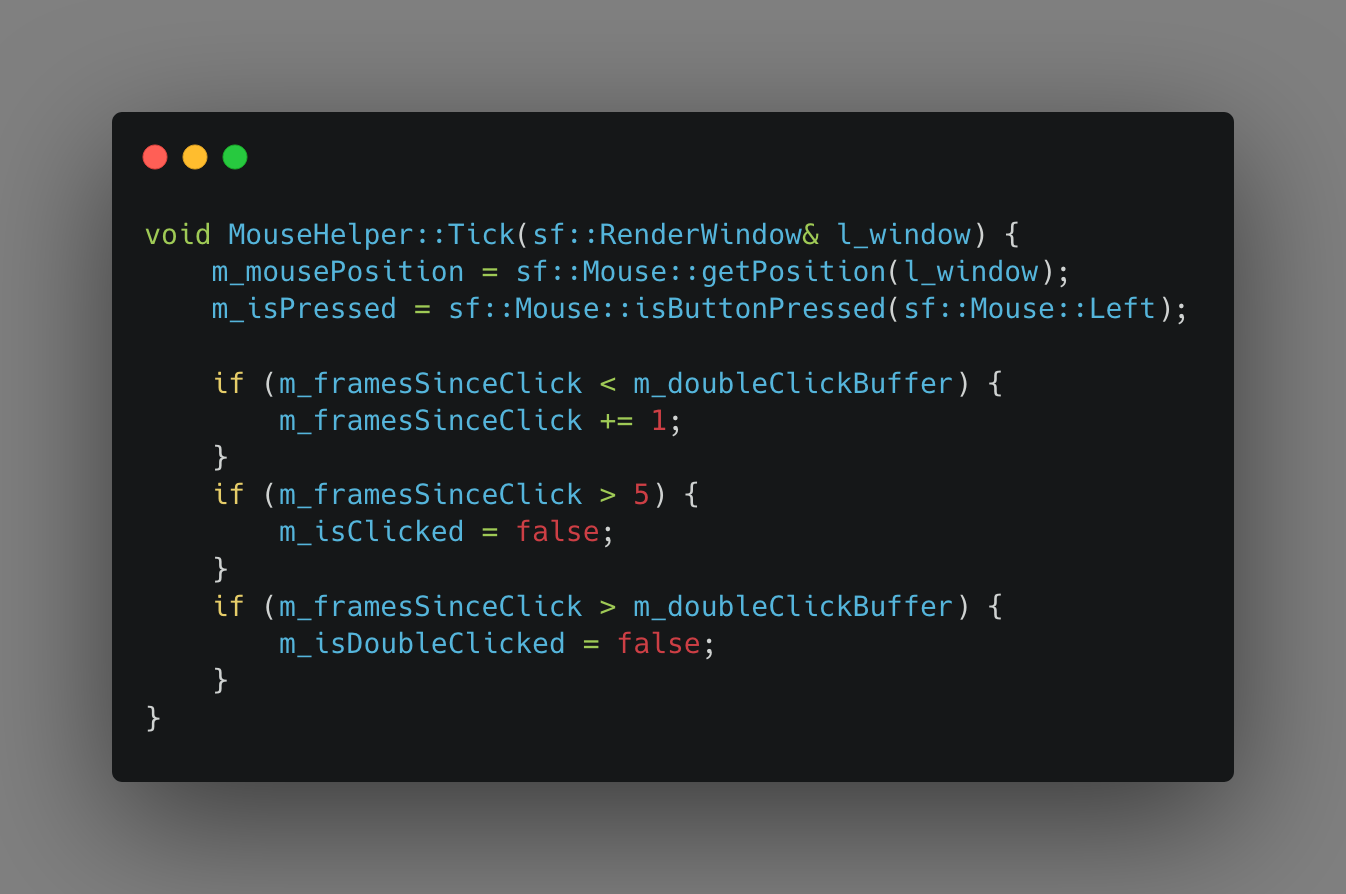 Just like the AABB collision that I wrote, there's probably some easy helper functionality built in to detect if a double-click has occurred. However, I want control, and the ability to tweak values. Also just to have the learning experience.